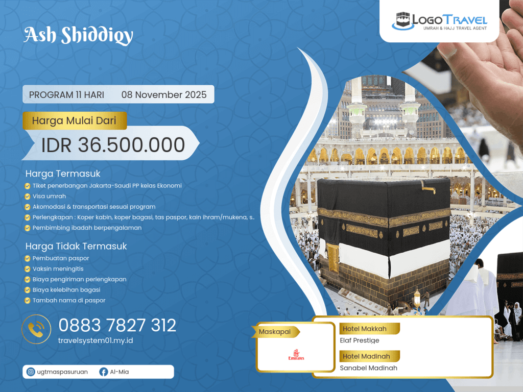 - Perlengkapan : Koper kabin, koper bagasi, tas paspor, kain ihram/mukena, sandal, buku manasik, kain seragam, syal, & sabuk